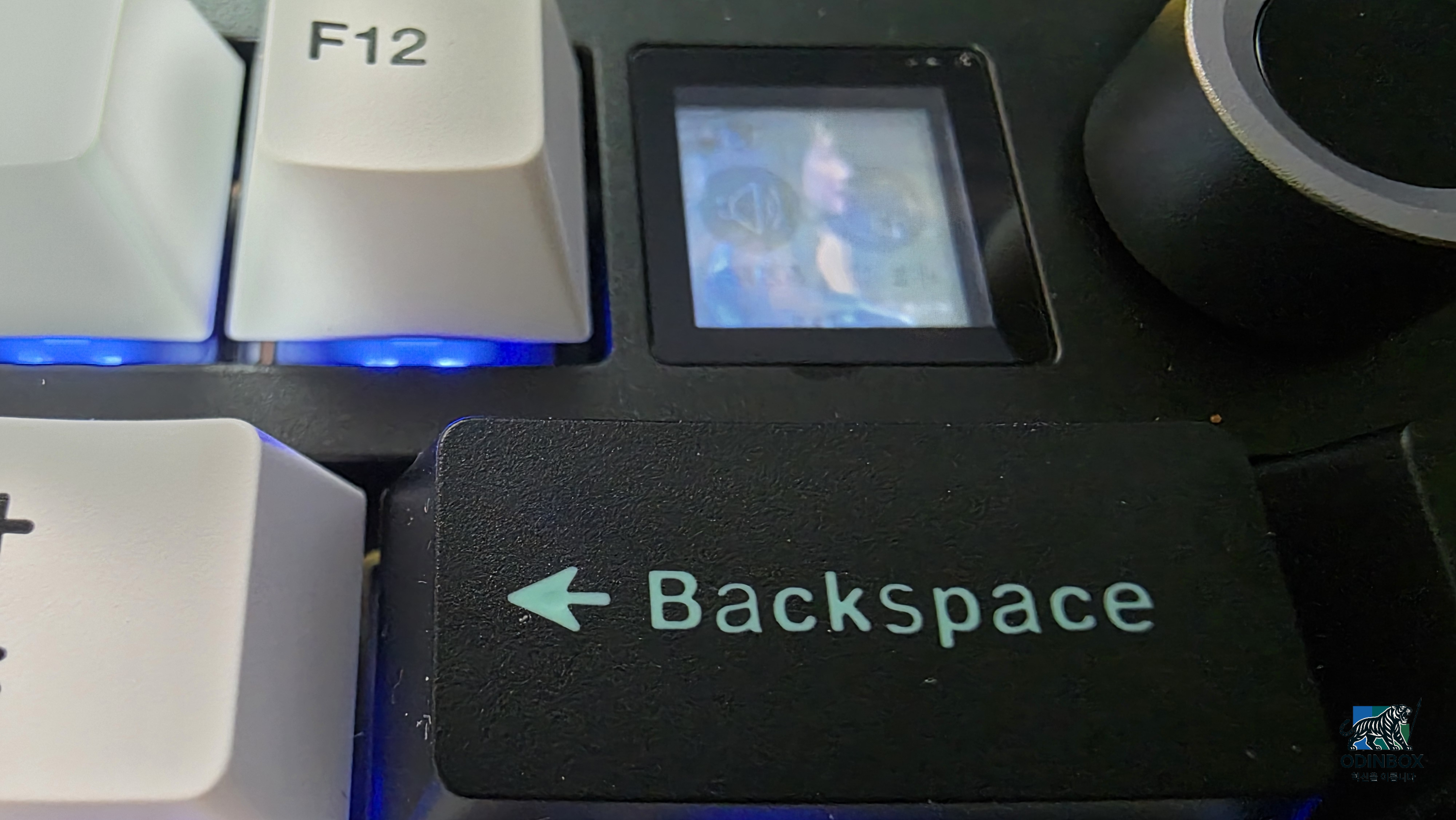 키보드를 살펴보면서 75% 배열의 레이아웃을 체감할 수 있었는데 방향키와 Delete, Page Up/Down 등의 기본 편집키는 모두 갖추면서도 풀배열 키보드보다 훨씬 콤팩트하게 공간을 줄인 구성이 인상적이었습니다. 상판 우측 상단에는 금속 재질의 볼륨 다이얼(노브)이 자리 잡고 있고 그 옆에 작은 TFT LCD 화면이 보입니다. 전원을 연결하니 이 화면에 배터리 잔량과 연결 모드 등이 아이콘으로 표시가 되는데 이 화면은 사용자가 원하는 GIF 이미지나 커스텀 로고를 넣어 꾸밀 수 있는 디스플레이입니다. 전반적인 첫인상은 "가격 대비 구성이 훌륭하고 재미있는 기능이 많은 키보드"라는 느낌으로 얼른 타건을 해보고 싶은 마음이 들게 했습니다.