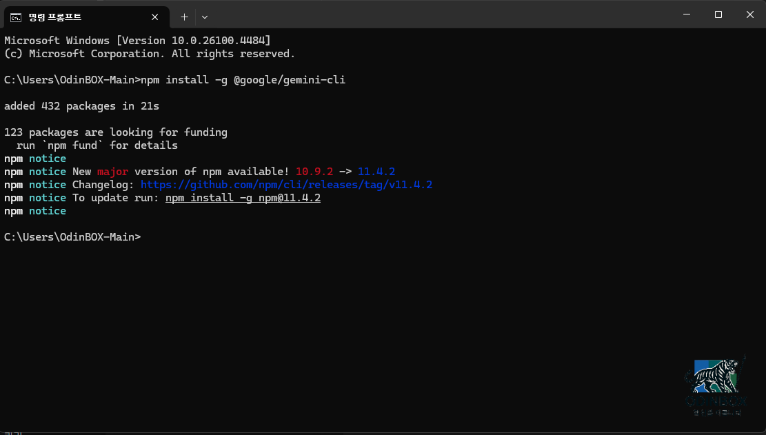 위 명령은 전역(-g) 옵션으로 Gemini CLI를 설치합니다. 설치 과정에서 인터넷을 통해 패키지를 내려받으므로 약간의 시간이 소모될 수 있습니다. 설치 완료 후 오류 없이 명령프롬프트로 돌아오게 되었다면 성공입니다.