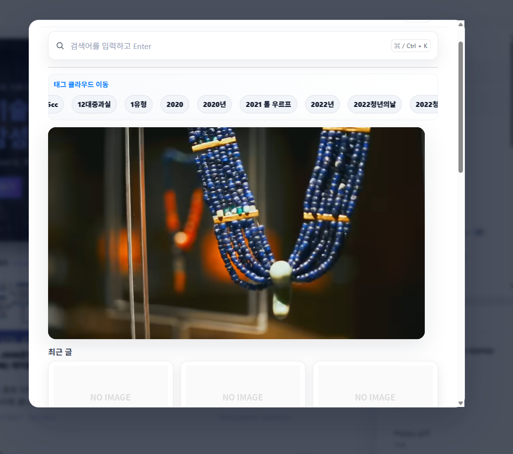 상단 우측의 검색 버튼을 누르면 중앙에 모달이 열립니다. 모달 내부에는 검색 입력창과 함께 최근 글 목록을 배치해 검색과 최신글 확인을 한 번에 처리합니다.