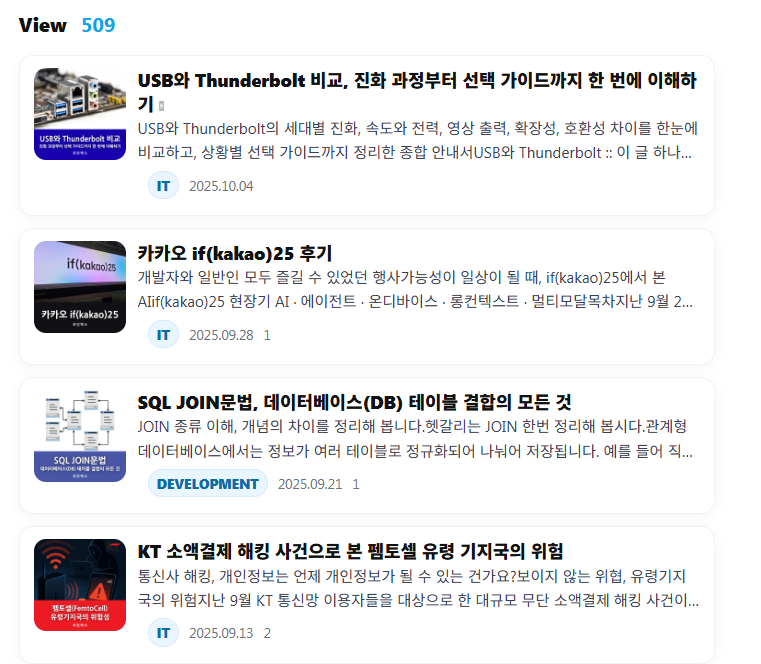 제목 나열형에서 벗어나 썸네일, 제목, 한 줄 미리보기로 구성했습니다. 어떤 글을 읽을지 판단이 빨라지고 목록의 시각적 일관성도 좋아졌습니다.